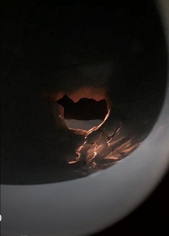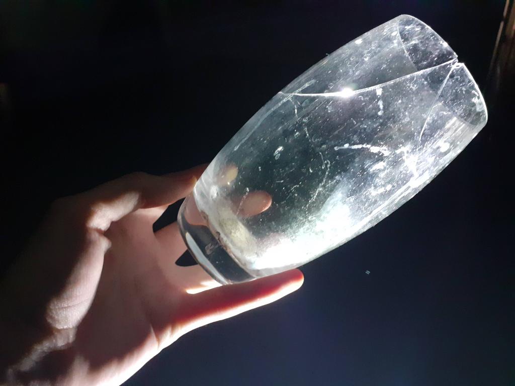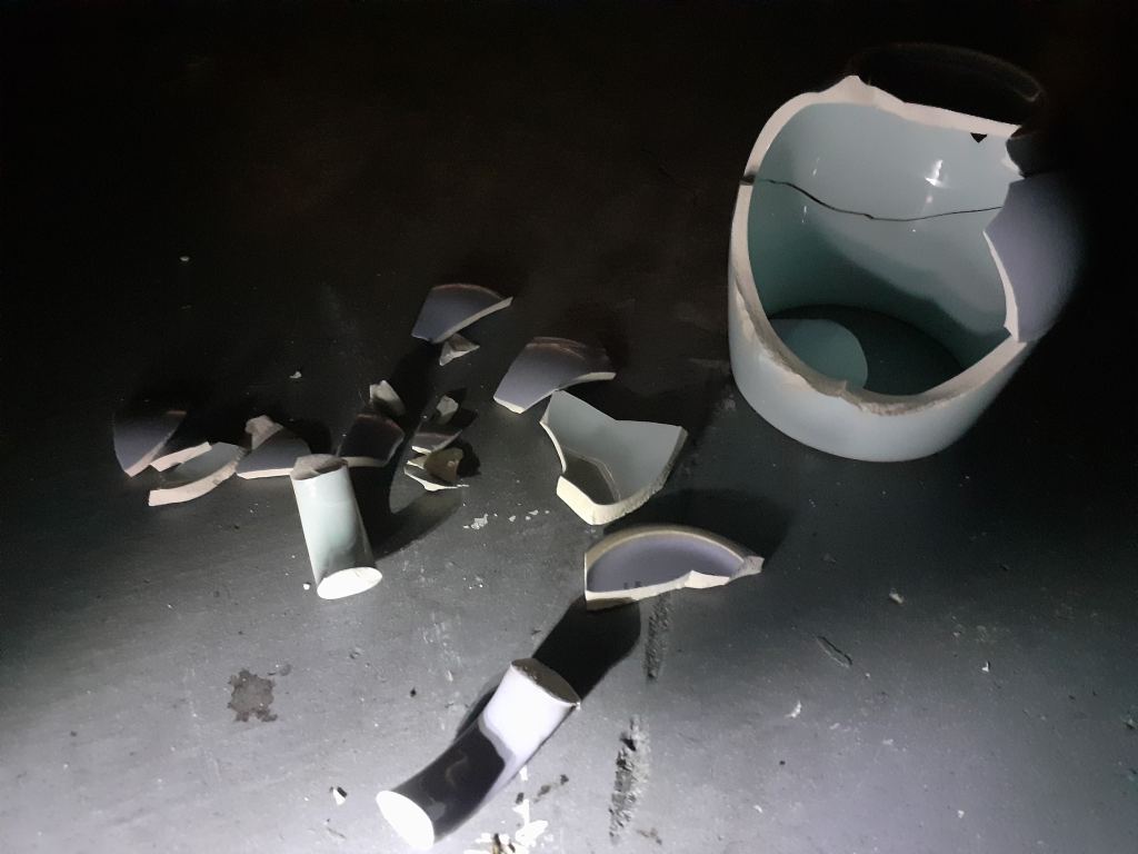 I experimented with creating patterns with light through the broken yet held together ceramic vessels I had. This cup cracked but held together, making it similar in concept to my framed glass pieces. I like the way light interacts with the cup, and creates lines and reflections from the cracks. I also like the act of keeping hold of an object which was otherwise going to be thrown away.